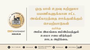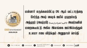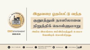 அதே வேளையில் அகில இலங்கை ஜம்இய்யத்துல் உலமாவின் நடவடிக்கைகள் அன்று முதல் இன்று வரையில் கட்சி அரசியல் சார்பற்றவையாகவே அமைந்து வருகின்றன என்பது தாங்கள் அறிந்த விடயமேயாகும். அந்த அடிப்படையில் நடைபெறவுள்ள உள்ளுராட்சி மன்றத் தேர்தல் காலப் பகுதியில் மாவட்ட மற்றும் பிரதேசக் கிளைகளின் பதவிதாங்குனர்கள் ஜம்இய்யாவின் கோட்பாடுகளைப் பாதுகாக்கும் வகையில் செயற்பட்டு, கட்சி அரசியல் நடவடிக்கைகளில் இருந்தும் அதற்கான பிரச்சாரப் பணிகளில் ஈடுபடுவதில் இருந்தும் தவிர்ந்து பூரண ஒத்துழைப்புக்களை வழங்குவீர்கள் என்று பெரிதும் எதிர்பார்க்கிறோம்.
