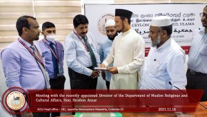 මෑතකදී මුස්ලිම් ආගමික හා සංස්කෘතික කටයුතු දෙපාර්තමේන්තුවේ අධ්යක්ෂ ලෙස පත් කරනු ලැබූ ගරු ඊබ්රාහිම් අන්සාර් මහතා සමග වූ සුහද හමුව Read More » නොවැම්බර් 17, 2021