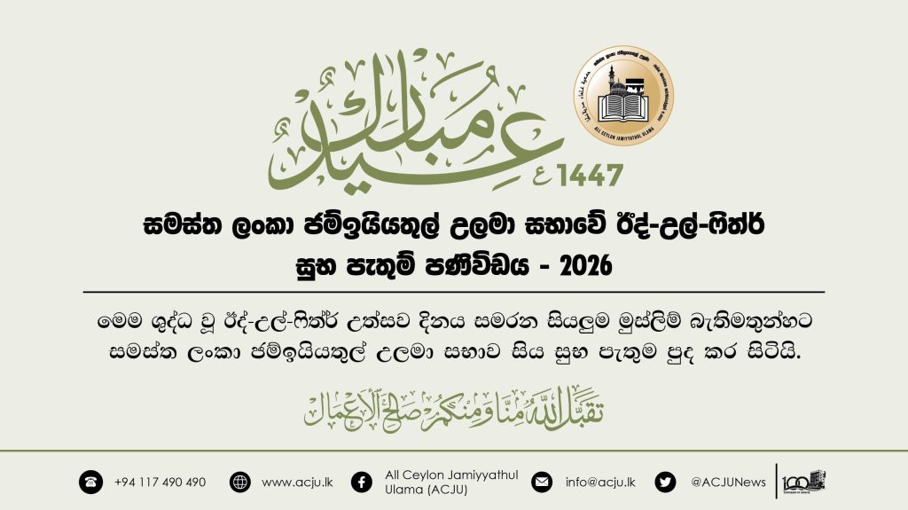 මෙම පුණ්ය රමළාන් ඊද් දිනදී, රට පුරා ඊදුල් ෆිත්ර් සමරන සියලුම සහෝදර සහෝදරියන්ට සමස්ත ලංකා ජම්ඉයියතුල් උලමා සභාව වෙනුවෙන් අපගේ උණුසුම් සුභ පැතුම් පිරිනමන්නෙමු.
