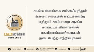 அகில இலங்கை ஜம்இய்யத்துல் உலமா சபையின் மட்டக்களப்பு மற்றும் அம்பாறை ஆகிய மாவட்டக் கிளைகளின் பதவிதாங்குனர்களுடன் நடைபெற்ற சந்திப்புக்கள் Read More » ஆனி 14, 2025