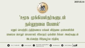 ‘சமூக முக்கியஸ்தர்களுடன் நல்லுறவை பேணல்’ எனும் செயற்றிட்டத்திற்கமைய மக்கள் விடுதலை முன்னணியின் கௌரவ பொதுச் செயலாளர் சகோதரர் டில்வின் சில்வா அவர்களுடன் இடம்பெற்ற சிநேகபூர்வ சந்திப்பு Read More » மாசி 14, 2025