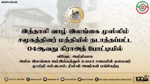 இத்தாலி வாழ் இலங்கை முஸ்லிம் சமூகத்தினர் மத்தியில் நடாத்தப்பட்ட 04ஆவது கிராஅத் போட்டி நிகழ்ச்சியில் விஷேட அதிதியாக அகில இலங்கை ஜம்இய்யத்துல் உலமா சபையின் தலைவர் முஃப்தி எம்.ஐ.எம். ரிஸ்வி அவர்கள் பங்கேற்பு Read More » மாசி 16, 2025