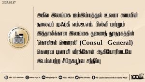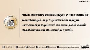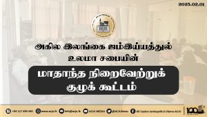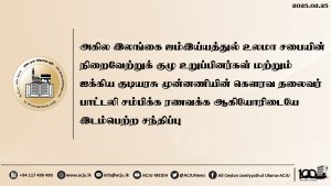 அகில இலங்கை ஜம்இய்யத்துல் உலமா சபையின் நிறைவேற்றுக் குழுக்கூட்டம் குழு உறுப்பினர்களின் பங்கேற்புடன் ஜம்இய்யாவின் தலைமையகத்தில் நடைபெற்றது Read More » மாசி 2, 2025