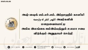 அஷ்-ஷைக் எம்.எச்.எம். இப்றாஹீம் காஸிமி (اللهم اغفر له وارحمه) அவர்களின் மறைவையொட்டி அகில இலங்கை ஜம்இய்யத்துல் உலமா சபை விடுக்கும் அனுதாபச் செய்தி Read More » மாசி 26, 2025