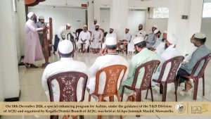 அவிசாவளை, கொட்டியாகும்புர பகுதியில் இடம்பெற்ற அல்-குர்ஆன் மத்ரஸாக்களில் கற்பிக்கும் முஅல்லிம்கள் மற்றும் முஅல்லிமாக்களுக்கான வலுவூட்டல் செயலமர்வு Read More » மார்கழி 2, 2024
