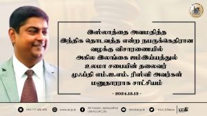 இஸ்லாத்தை அவமதித்த இந்திக தொடவத்த என்ற நபருக்கெதிரான வழக்கு விசாரணையில் அகில இலங்கை ஜம்இய்யத்துல் உலமா சபையின் தலைவர் முஃப்தி எம்.ஐ.எம். ரிஸ்வி அவர்கள் மனுதாரராக சாட்சியம் Read More » மார்கழி 13, 2024