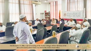 அகில இலங்கை ஜம்இய்யத்துல் உலமா சபையின் அரபுக் கல்லூரிகள் விவகாரக் குழுவினரின் விஷேட ஒன்றுகூடல் Read More » மார்கழி 13, 2024