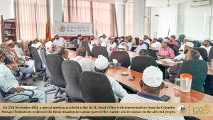 சீரற்ற வானிலையினால் நாட்டின் பல பகுதிகளிலும் பாதிக்கப்பட்டுள்ள மக்களின் இயல்பு வாழ்க்கை குறித்து கலந்துரையாடுவதற்காக கொழும்பு மாவட்ட பள்ளிவாயல்கள் சம்மேளன பிரதிநிதிகளுடன் இடம்பெற்ற சந்திப்பு Read More » மார்கழி 2, 2024