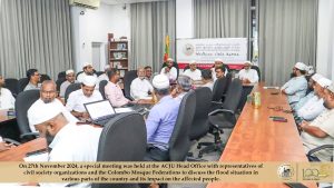 சீரற்ற வானிலையினால் நாட்டின் பல பகுதிகளிலும் பாதிக்கப்பட்டுள்ள மக்களின் இயல்பு வாழ்க்கை குறித்து கலந்துரையாடுவதற்காக சிவில் சமூக அமைப்புகள் மற்றும் கொழும்பு மாவட்ட பள்ளிவாயல்கள் சம்மேளனங்களுடன் இடம்பெற்ற சந்திப்பு Read More » கார்த்திகை 29, 2024