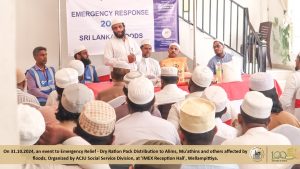 அகில இலங்கை ஜம்இய்யத்துல் உலமா சபையின் சமூக சேவைக் குழுவின் ஏற்பாட்டில் வெள்ள அனர்த்தத்தினால் பாதிக்கப்பட்ட ஆலிம்கள், முஅத்தின்கள் மற்றும் ஏனையோருக்கான உலர் உணவுப் பொதிகள் வழங்கி வைப்பு Read More » ஐப்பசி 31, 2024