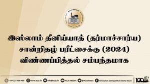 இஸ்லாம் தீனிய்யாத் (தர்மாச்சார்ய) சான்றிதழ் பரீட்சைக்கு (2024) விண்ணப்பித்தல் சம்பந்தமாக Read More » ஆவணி 27, 2024