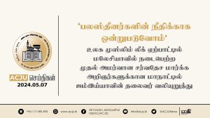 ‘பலஸ்தீனர்களின் நீதிக்காக ஒன்றுபடுவோம்’ – உலக முஸ்லிம் லீக் ஏற்பாட்டில் மலேசியாவில் நடைபெற்ற முதல் அமர்வான சர்வதேச மார்க்க அறிஞர்களுக்கான மாநாட்டில் ஜம்இய்யாவின் தலைவர் வலியுறுத்து Read More » வைகாசி 7, 2024