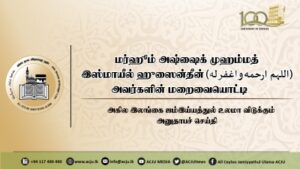மர்ஹும் அஷ்ஷைக் முஹம்மத் இஸ்மாயீல் ஹுஸைன்தீன் (اللهم ارحمه و اغفر له) அவர்களின் மறைவையொட்டி அகில இலங்கை ஜம்இய்யத்துல் உலமா விடுக்கும் அனுதாபச்செய்தி Read More » புரட்டாதி 27, 2023