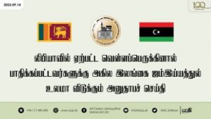 லிபியாவில் ஏற்பட்ட வெள்ளப்பெருக்கினால் பாதிக்கப்பட்டவர்களுக்கு அகில இலங்கை ஜம்இய்யத்துல் உலமா விடுக்கும் அனுதாபச் செய்தி Read More » புரட்டாதி 14, 2023