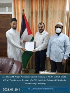 அகில இலங்கை ஜம்இய்யத்துல் உலமாவின் பொதுச் செயலாளர் அவர்களும், உதவிப் பொதுச் செயலாளர் அவர்களும் பாலஸ்தீன தூதரகத்திற்கு விஜயம் Read More » வைகாசி 20, 2021