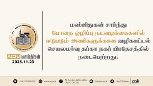 அனர்த்த நிவாரணப் பணிகள் இடம்பெற்று வரும் ஜுமுஆ மஸ்ஜிதுகளை ACJU தலைவர் நேரில் சென்று பார்வையிட்டார் Read More » மார்கழி 4, 2025