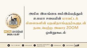 அகில இலங்கை ஜம்இய்யத்துல் உலமா சபையின் மாவட்டக் கிளைகளின் பதவிதாங்குநர்களுடன் நடைபெற்ற அவசர ZOOM ஒன்றுகூடல் Read More » மார்கழி 7, 2025