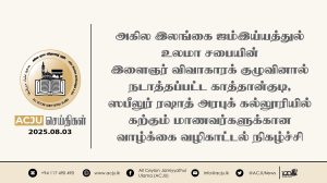 அகில இலங்கை ஜம்இய்யத்துல் உலமா சபையின் இளைஞர் விவாகாரக் குழுவினால் நடாத்தப்பட்ட காத்தான்குடி, ஸபீலுர் ரஷாத் அரபுக் கல்லூரியில் கற்கும் மாணவர்களுக்கான வாழ்க்கை வழிகாட்டல் நிகழ்ச்சி Read More » ஆவணி 3, 2025