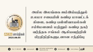 அகில இலங்கை ஜம்இய்யத்துல் உலமா சபையின் கண்டி மாவட்டக் கிளை, கண்டி பள்ளிவாயல்கள் சம்மேளனம் மற்றும் கண்டி நகர் வர்த்தக சங்கம் ஆகியவற்றின் பிரதிநிதிகளுடனான சந்திப்பு Read More » ஆவணி 5, 2025