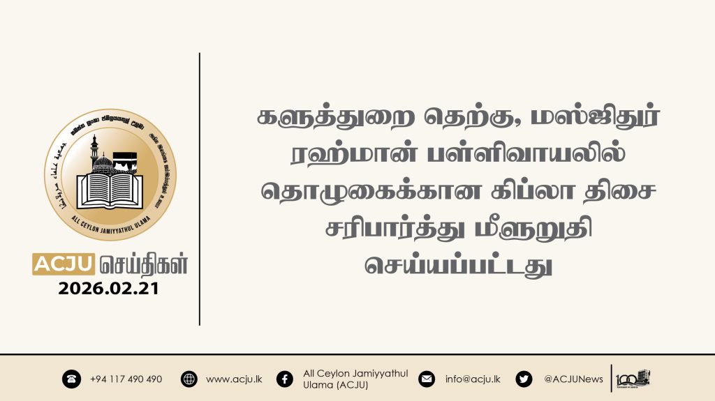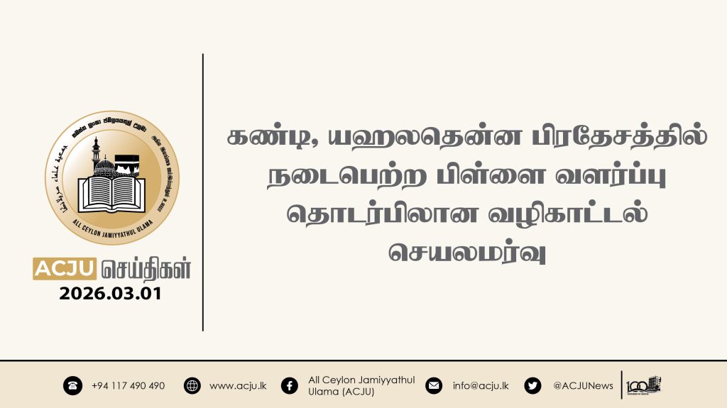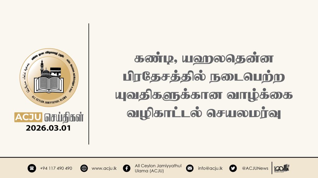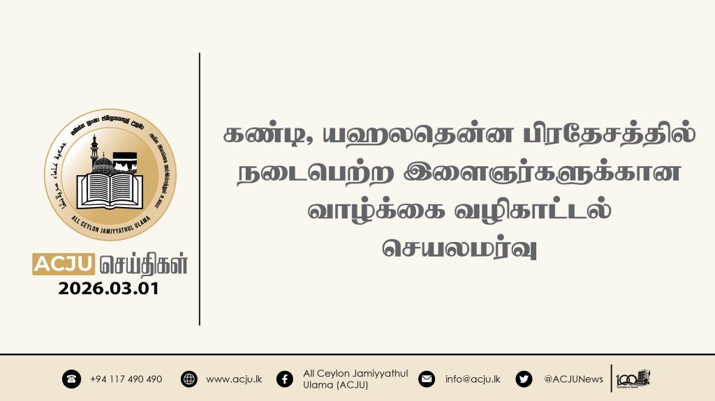 2026 மார்ச் 02ஆம் திகதி, அகில இலங்கை ஜம்இய்யத்துல் உலமா சபையின் இளைஞர் விவகாரப் பிரிவின் நெறிப்படுத்தலில் இளைஞர்கள் மற்றும் அவர்களது பெற்றோர்களுக்கான வாழ்க்கை வழிகாட்டல் செயலமர்வு […]