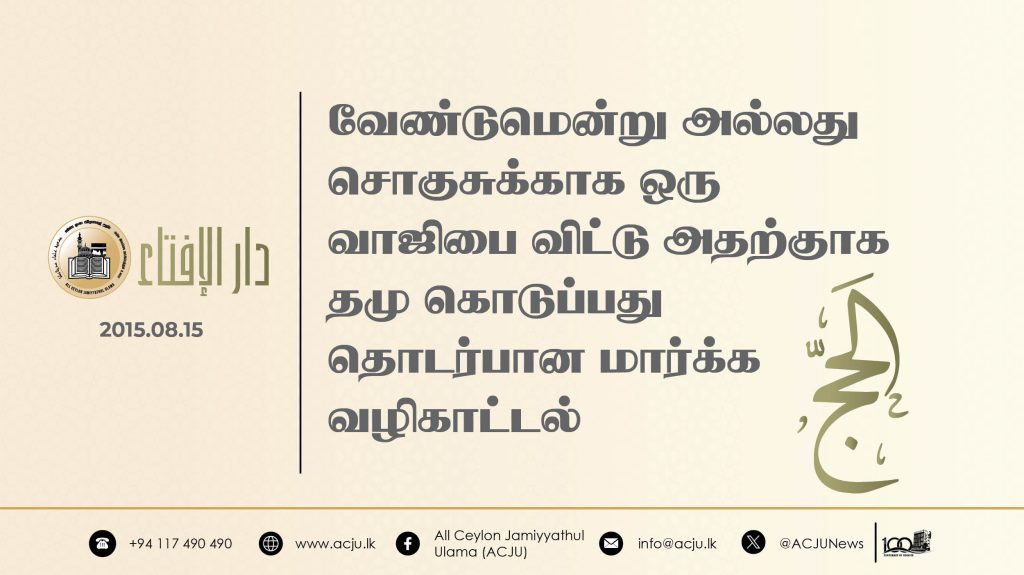 ஃபத்வா, ஹஜ் மற்றும் உம்ராவேண்டுமென்று அல்லது சொகுசுக்காக ஒரு வாஜிபை விட்டு அதற்குhக தமு கொடுப்பது தொடர்பான மார்க்க வழிகாட்டல் ஆவணி 15, 2015