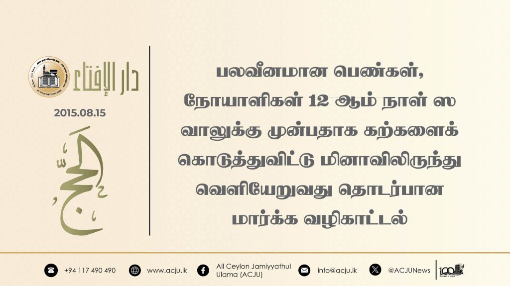 ஃபத்வா, ஹஜ் மற்றும் உம்ராபலவீனமான பெண்கள், நோயாளிகள் 12 ஆம் நாள் ஸவாலுக்கு முன்பதாக கற்களைக் கொடுத்துவிட்டு மினாவிலிருந்து வெளியேறுவது தொடர்பான மார்க்க வழிகாட்டல் ஆவணி 15, 2015
