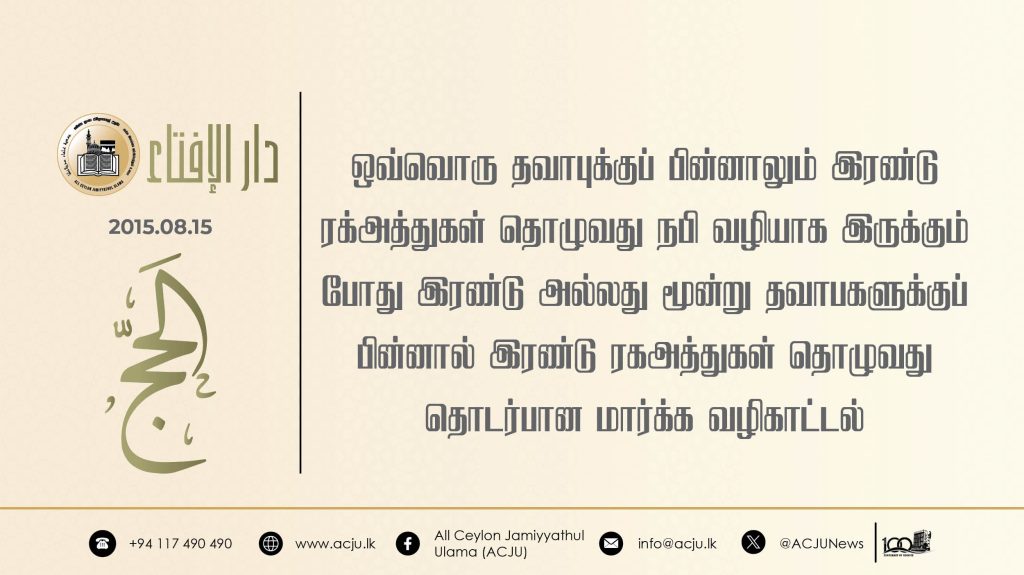 ஃபத்வா, ஹஜ் மற்றும் உம்ராஒவ்வொரு தவாபுக்குப் பின்னாலும் இரண்டு ரக்அத்துகள் தொழுவது நபி வழியாக இருக்கும் போது இரண்டு அல்லது மூன்று தவாபகளுக்குப் பின்னால் இரண்டு ரகஅத்துகள் தொழுவது தொடர்பான மார்க்க வழிகாட்டல் ஆவணி 15, 2015