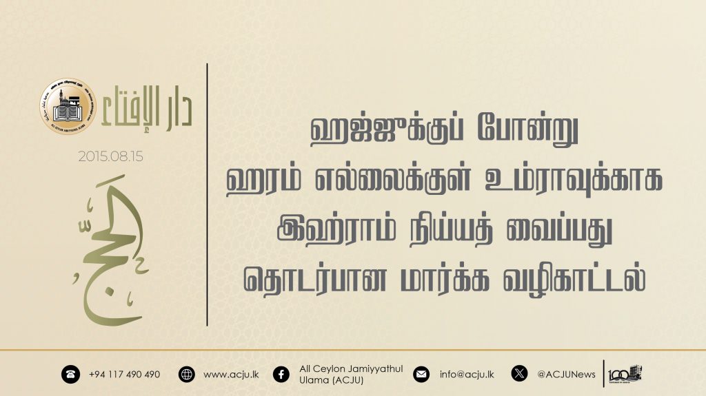 ஃபத்வா, ஹஜ் மற்றும் உம்ராஹஜ்ஜுக்குப் போன்று ஹரம் எல்லைக்குள் உம்ராவுக்காக இஹ்ராம் நிய்யத் வைப்பது தொடர்பான மார்க்க வழிகாட்டல் ஆவணி 15, 2015