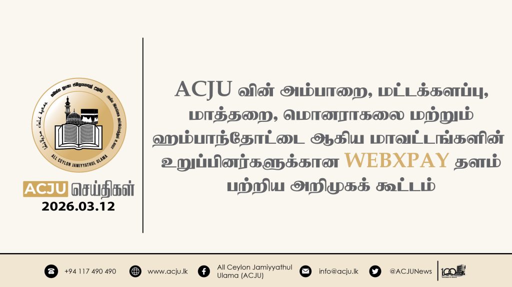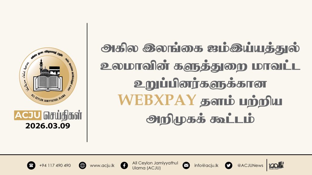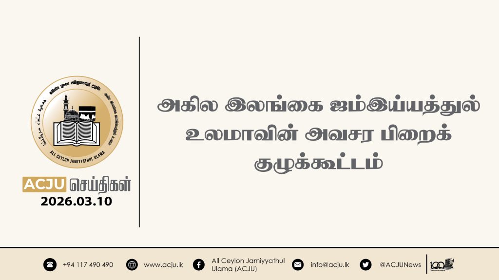 2026 மார்ச் 14ஆம் திகதி, அகில இலங்கை ஜம்இய்யத்துல் உலமாவின் இளைஞர் விவகாரப் பிரிவின் நெறிப்படுத்தலில் நுவரெலியா, மீபிலிமன்ன ஜுமுஆ பள்ளிவாயல் மஹல்லாவிற்குட்பட்ட இளைஞர்களுக்கான வாழ்க்கை வழிகாட்டல் […]