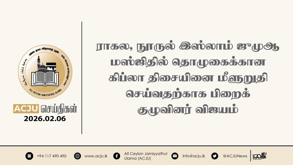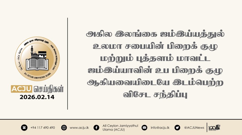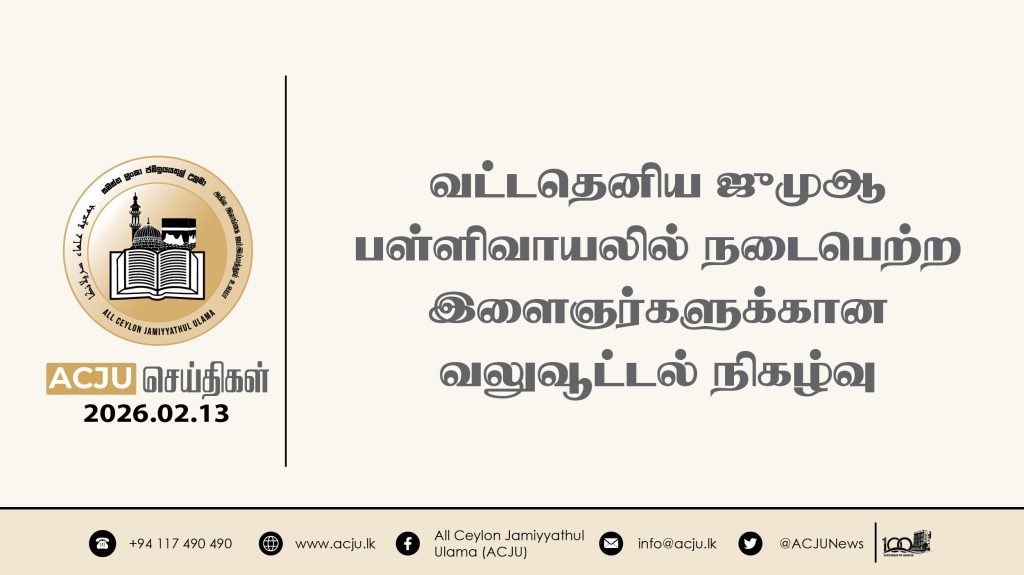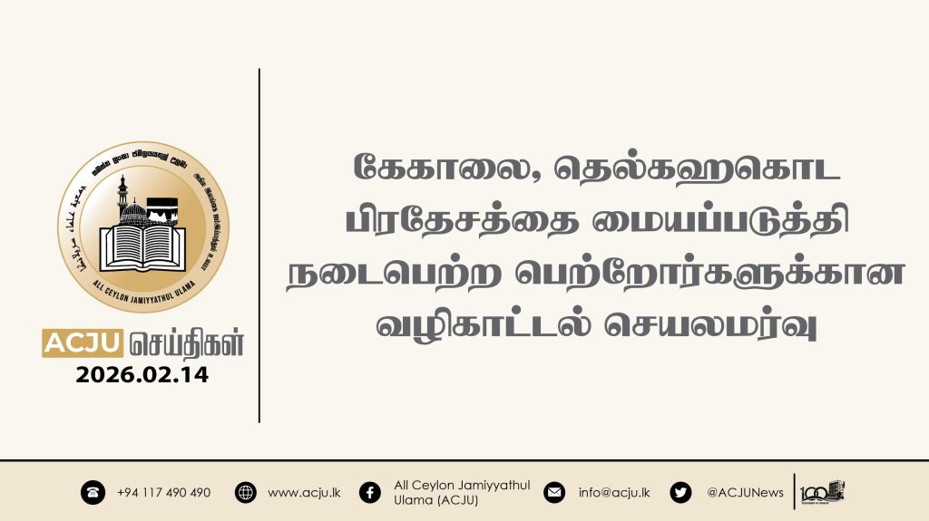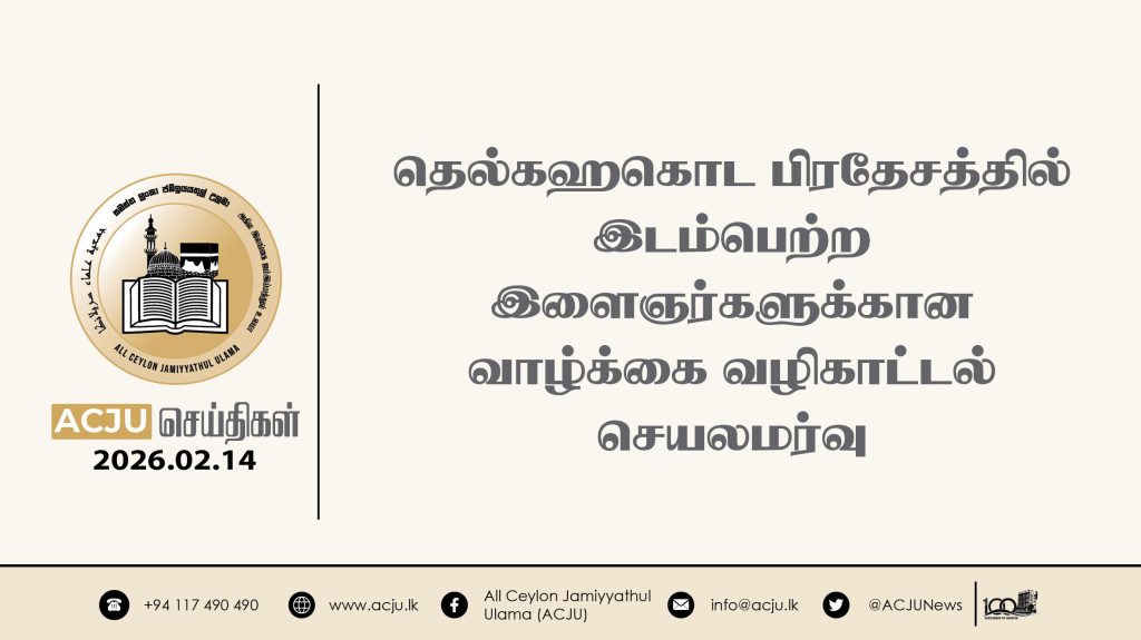 2026 பெப்ரவரி 14ஆம் திகதி, அகில இலங்கை ஜம்இய்யத்துல் உலமா சபையின் இளைஞர் விவாகாரப் பிரிவின் நெறிப்படுத்தலில் கேகாலை, தெல்கஹகொட பிரதேச இளைஞர்களுக்கான வாழ்க்கை வழிகாட்டல் செயலமர்வொன்று […]