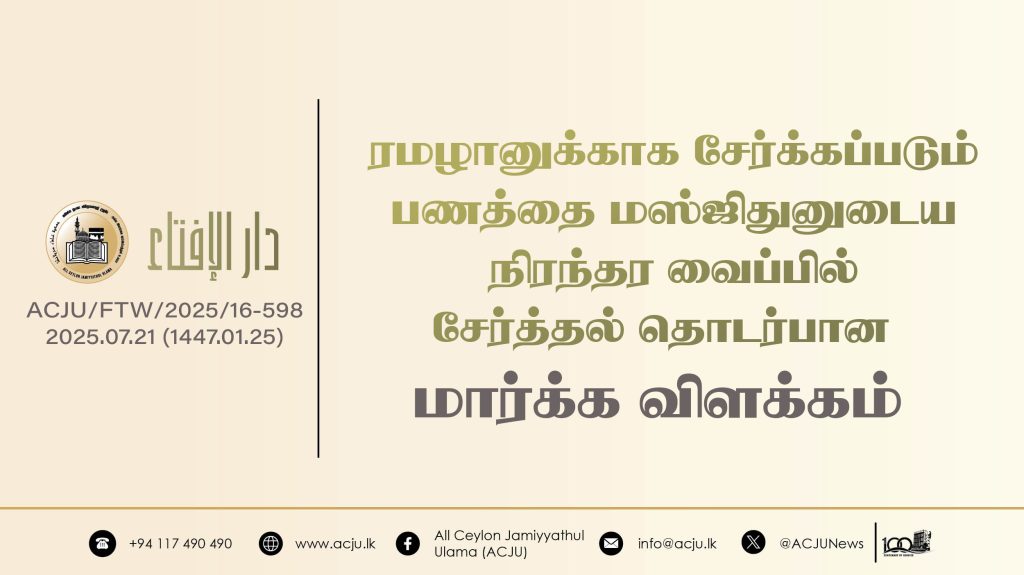 ஃபத்வா, வக்ப் மற்றும் மஸ்ஜித்ரமழானுக்காக சேர்க்கப்படும் பணத்தை மஸ்ஜிதுனுடைய நிரந்தர வைப்பில் சேர்த்தல் தொடர்பான மார்க்க விளக்கம் ஆடி 21, 2025