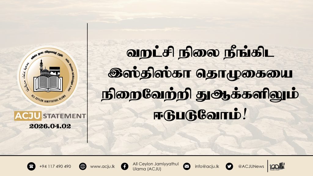 எனவே, எமது பாவங்களுக்காக நாம் தவ்பா செய்து, இஸ்திக்ஃபார் செய்து, வீண்விரயங்களைத் தவிர்த்து, தானதர்மங்களில் ஈடுபட்டு, நாடு முழுவதும் நிலவும் வறட்சி நீங்கி மழை பொழிய அல்லாஹ்விடம் பிரார்த்தனை செய்யுமாறு சகல முஸ்லிம்களையும் கேட்டுக் கொள்கின்றோம்.
