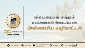 அத்துடன் சுகாதார அமைச்சு, வக்பு சபை மற்றும் அகில இலங்கை ஜம்இய்யத்துல் உலமா ஆகியன வழங்கியுள்ள வழிகாட்டல்களை மக்கள் பின்பற்ற ஊக்குவிக்கும் விதமாகவும், கவனயீனமாக செயற்படும் போது ஏற்படும் விபரீதங்களை எடுத்துக்காட்டியும் இவ்வார குத்பா பிரசங்கங்களை சுருக்கமாக அமைத்துக் கொள்ளுமாறு கண்ணியம்மிக்க கதீப்மார்களை அன்பாக வேண்டிக் கொள்கின்றோம்.
