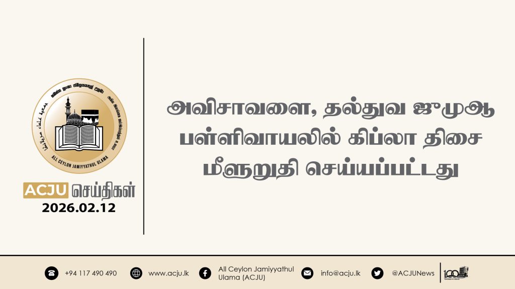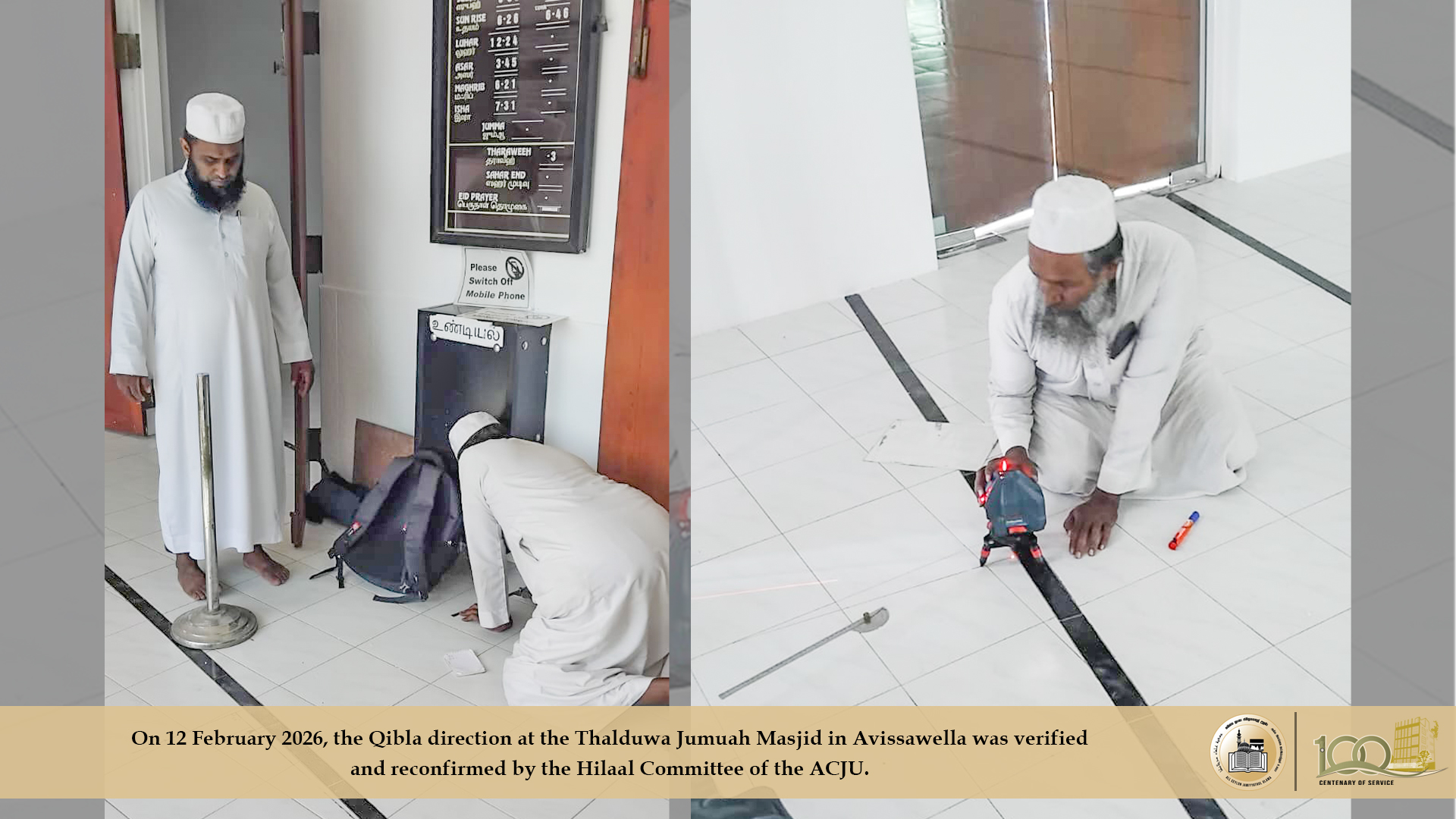 2026 பெப்ரவரி 12ஆம் திகதி, அகில இலங்கை ஜம்இய்யத்துல் உலமாவின் பிறைக் குழுவினால் அவிசாவளை, தல்துவ ஜுமுஆ பள்ளிவாயலில் தொழுகைக்கான கிப்லா திசை சரிபார்க்கப்பட்டு மீளுறுதி செய்யப்பட்டது.