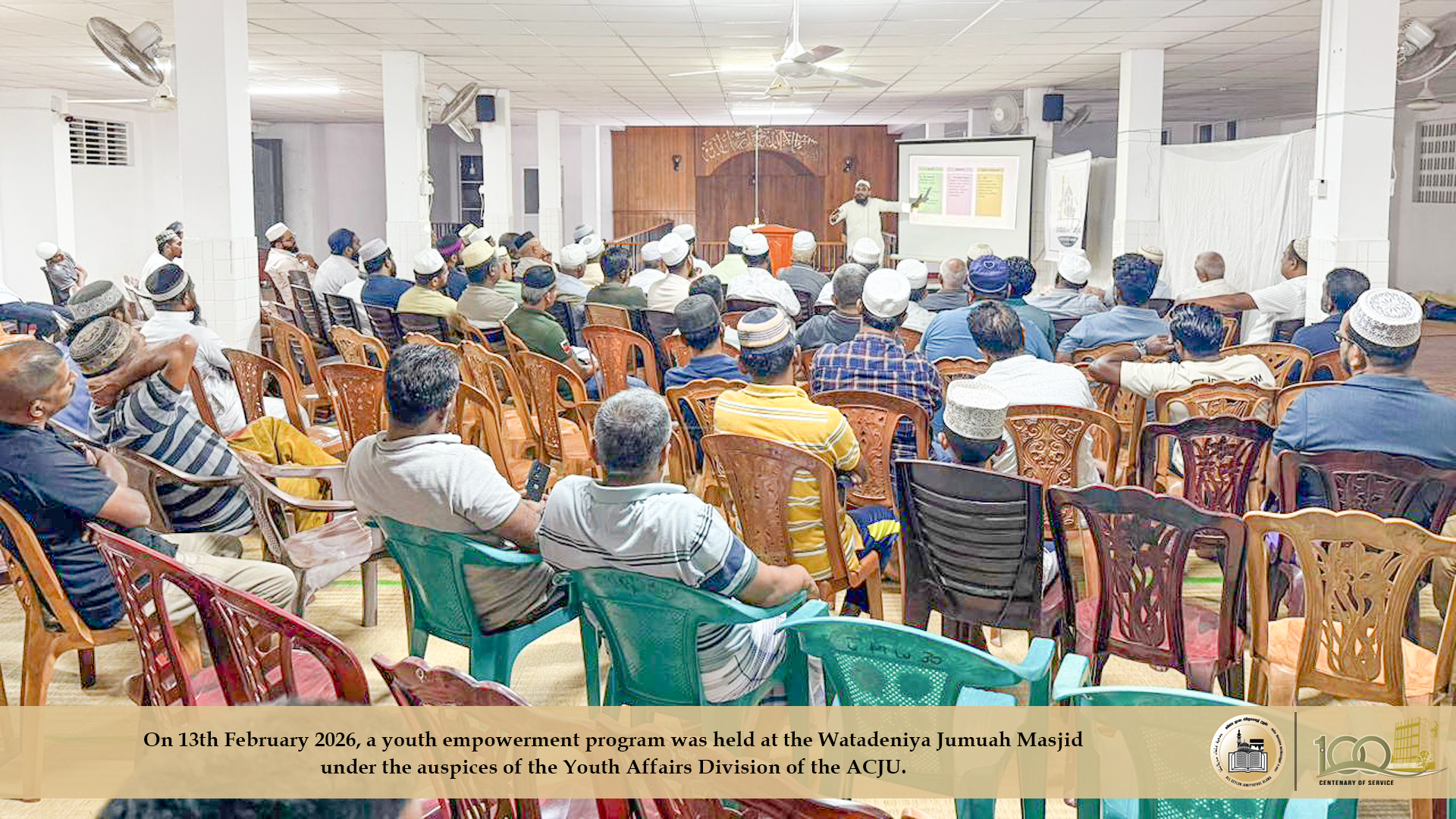 2026 பெப்ரவரி 13ஆம் திகதி, அகில இலங்கை ஜம்இய்யத்துல் உலமா சபையின் இளைஞர் விவகாரப் பிரிவின் நெறிப்படுத்தலில் இளைஞர்களுக்கான வலுவூட்டல் நிகழ்வு வட்டதெனிய ஜுமுஆ பள்ளிவாயலில் நடைபெற்றது.